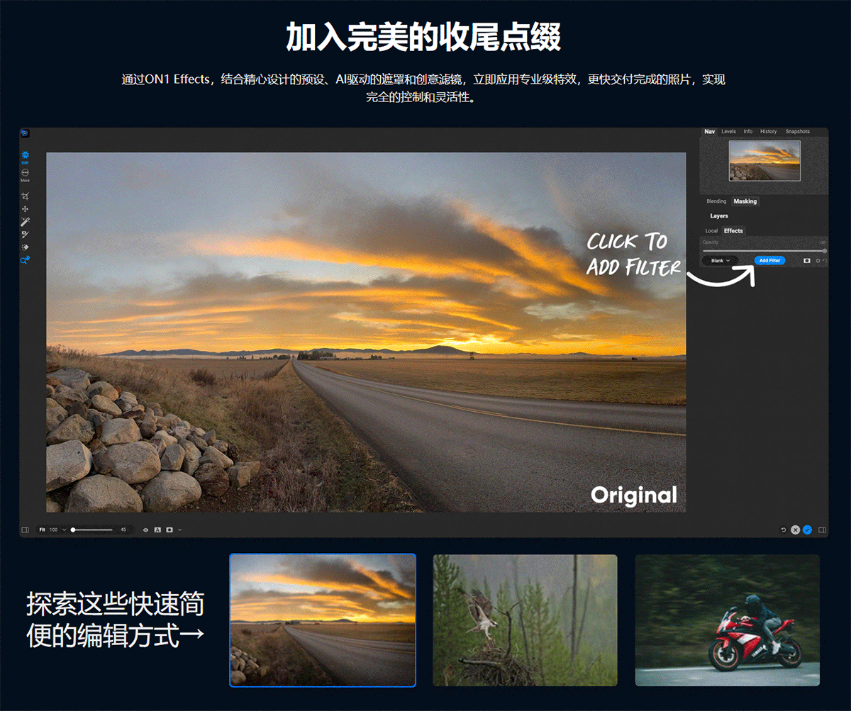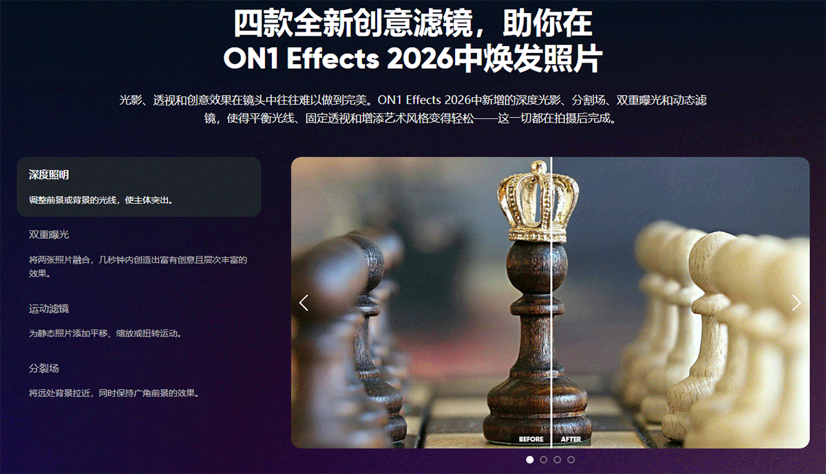 ON1 Effects 2026 新增了强大的创意滤镜、更智能的 AI 蒙版(可一键选择主体和背景)以及更多 工具,让您的照片栩栩如生。